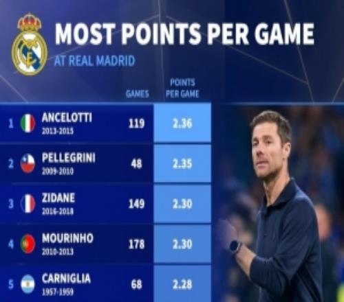 皇马主帅场均积分排名:安切洛蒂2.36分居首,阿隆索2.24分第七