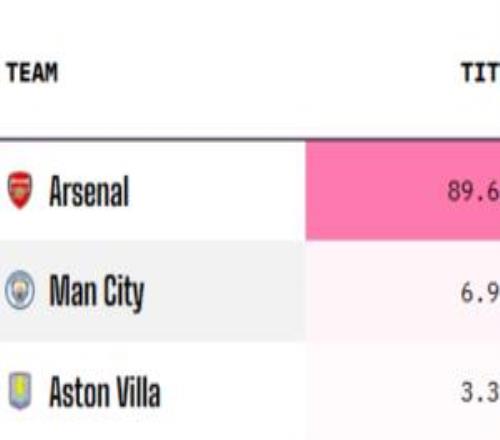 已近九成!英超最新夺冠概率:阿森纳89.6%,曼城6.9%,维拉3.36%