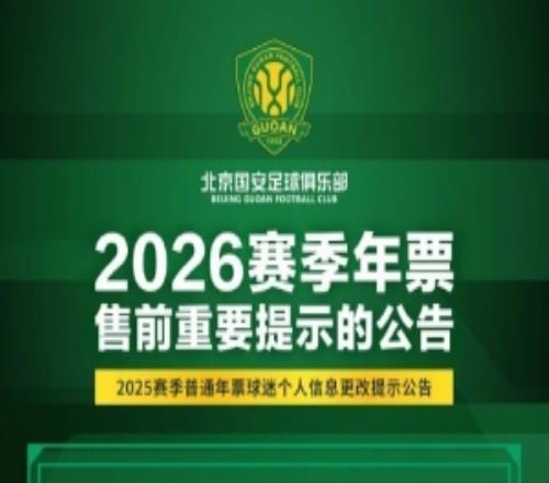 尊敬的球迷朋友,大家好!俱乐部将于春节假期后启动2026赛季年票发售工作。为了方便2025赛季已购年票球迷进行原...